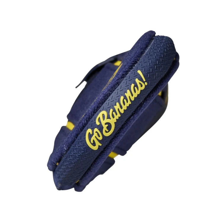 Be the star of the show on the base paths with the X-SRZ™ Savannah Bananas Sliding Mitt 2.0, designed to protect your hand on hard slides while taking the extra base. EvoShield’s updated baseball and softball sliding mitt features a Navy Blue look with Banana Yellow accents to match the great baseball circus based in Savannah, Georgia. Bananas logos appear across the wrist and rubber finger bumper, and channels along the palm and backhand improve dexterity to grip the base. The rubber bumper along the top protects fingertips when jammed up against the base, and the elastic compression strap secures the mitt and supports the wrist.